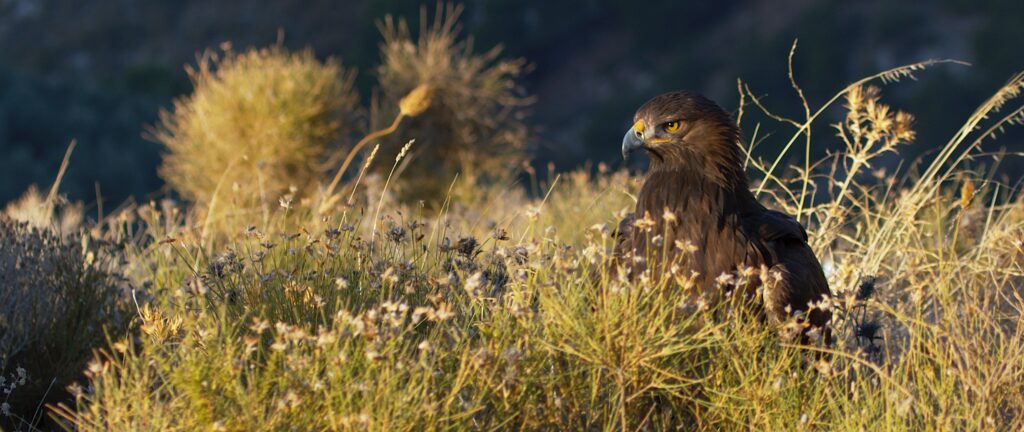 En cuanto a flora, los pinares de la Sierra de Rute —pino carrasco (Pinus halepensis), pino negral (Pinus pinaster)— se mezclan con manchas de encina (Quercus ilex subsp. ballota), quejigo (Quercus faginea), coscoja (Quercus coccifera), lentisco (Pistacia lentiscus), romero (Salvia rosmarinus) y tomillos (Thymus spp.), además de sabinas y arces en cortados frescos. Esa mezcla de bosque mediterráneo, matorral y roca caliza genera bordes abiertos con suelo desnudo: el hábitat perfecto para el chotacabras pardo y un escenario continuo de caza para el águila real. Observación responsable: Al anochecer, camina sólo por pistas forestales ya abiertas. No entres en claros con vegetación baja ni intentes acercarte a pollos de chotacabras pardo. Cualquier intrusión innecesaria puede hacer que los adultos trasladen al pollo y malgasten energía crítica.