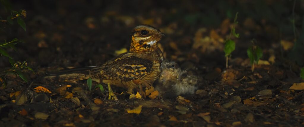 Este camuflaje es vital porque el chotacabras pardo no construye nido. La hembra deposita los huevos directamente sobre el suelo desnudo, entre acículas de pino, pequeñas piedras calizas y trozos de corteza. Eso lo hace vulnerable: pisadas humanas fuera de sendero, paso de vehículos o la simple presencia de perros sueltos pueden destruir una puesta. Si el lugar queda demasiado expuesto, los adultos pueden mover los huevos o incluso desplazar al pollo recién eclosionado unos metros, hasta una zona con mejor cobertura o menos riesgo. Esta conducta —tan delicada como sorprendente— es una de las más espectaculares conductas parentales de la especie.