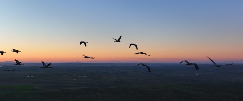 La grulla, por su parte, cuenta con su propia secuencia en la película, mostrando los vuelos en “V”, los dormideros y los sonidos trompeteantes de los bandos invernantes. De nuevo, el Alto Guadiato ofrece el mismo tipo de ambiente: dehesas con agua, cultivos de cereal y grandes dormideros de grullas que llegan del norte de Europa para pasar el invierno.